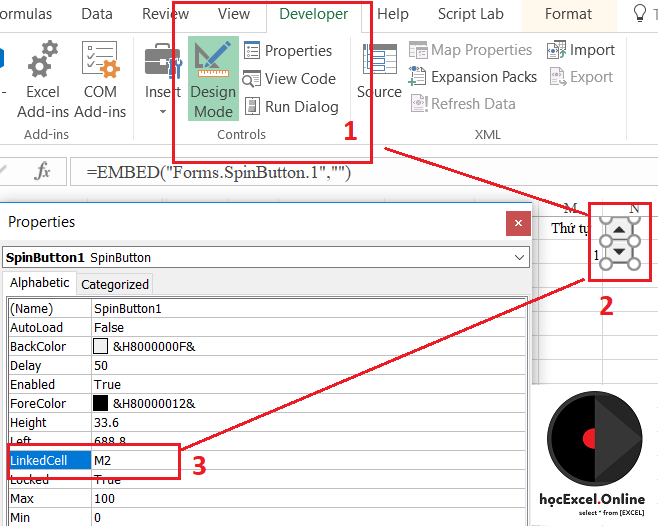 Trong Tab Developer > Chọn Design Mode > Click chuột phải vào Spin button và chọn Properties > Trong cửa sổ Properties chú ý mục LinkedCell. Tại đây bạn chọn nơi muốn liên kết tới vị trí đặt kết quả.