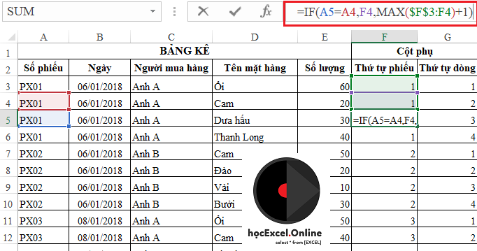 Diễn giải tính logic: Nếu dòng số phiếu đang xét = số phiếu tại dòng trước đó thì thứ tự phiếu không đổi; nếu khác thì sẽ tăng số thứ tự lên 1 đơn vị (giá trị lớn nhất của vùng trước đó + 1)