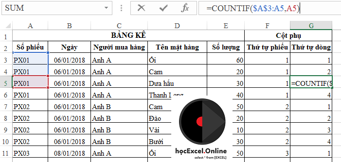 - F1:F26&G1:G26 là ghép giữa 2 cột Thứ tự phiếu và Thứ tự dòng trong phần cột phụ của bảng kê