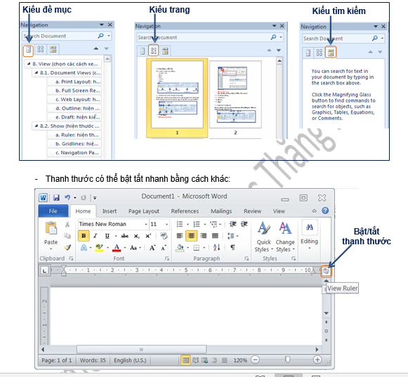 Có thể bật/tắt (hiển thị/không hiển thị) thanh thước – Ruler, đường lưới – Gridlines, hoặc khung định vị – Navigation Pane bằng cách chọn/bỏ chọn các công cụ này trong nhóm Show của tab