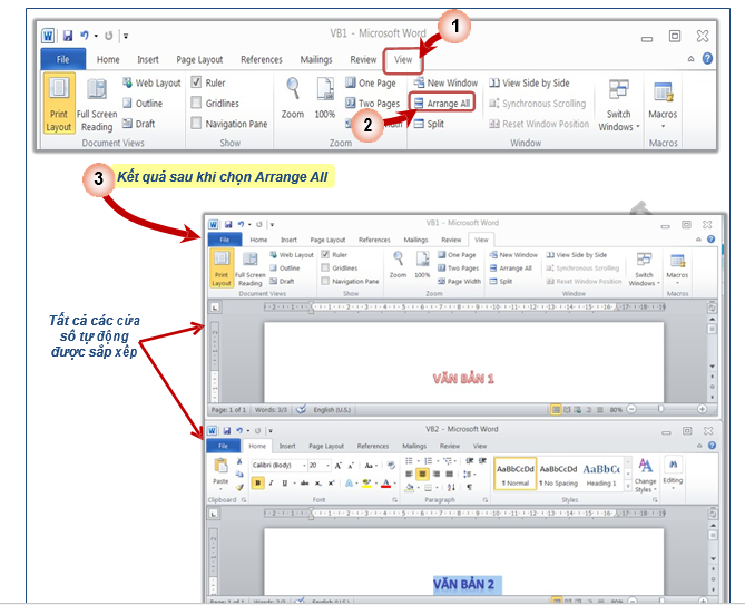 + Mở các cửa sổ chứa file cần xem song song (giả sử ta đang mở 2 file vb1.docx và vb2.docx), trong tab View à chọn View Arrange All
