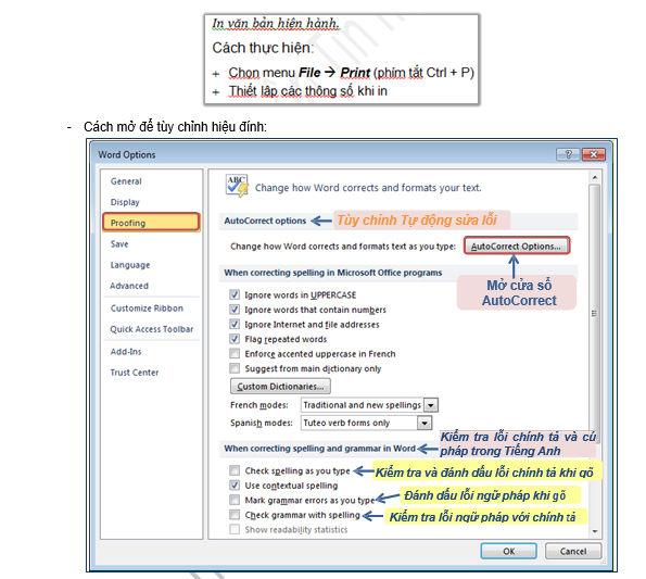 Thiết lập cách sửa lỗi, kiểm tra lỗi chính tả và cú pháp cho văn bản.