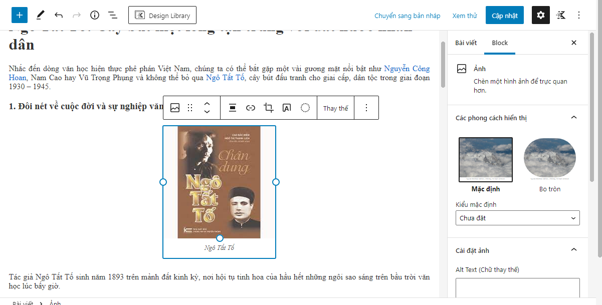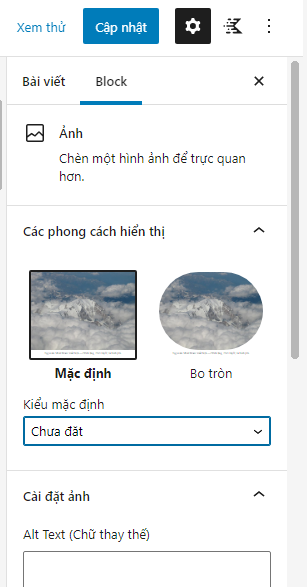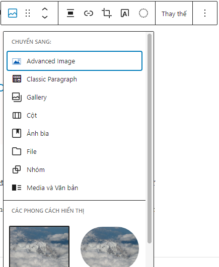 - Ảnh: Đổi kiểu Block hoặc Style. Click chuột vào nút này, bạn sẽ thấy một trình thả xuống với các kiểu hình ảnh, cho phép bạn tùy chọn để thay đổi. Bạn cũng có thể tùy chọn “Phong cách hiển thị” cho hình ảnh là “Mặc định” hoặc “Bo tròn”.
