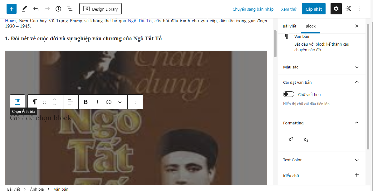 - Thêm chữ đè trên ảnh: Click vào nút này thì hình ảnh sẽ tự động chuyển sang kiểu “Ảnh bìa”, sau đó bạn nhập đoạn mô tả lên trên bức ảnh.